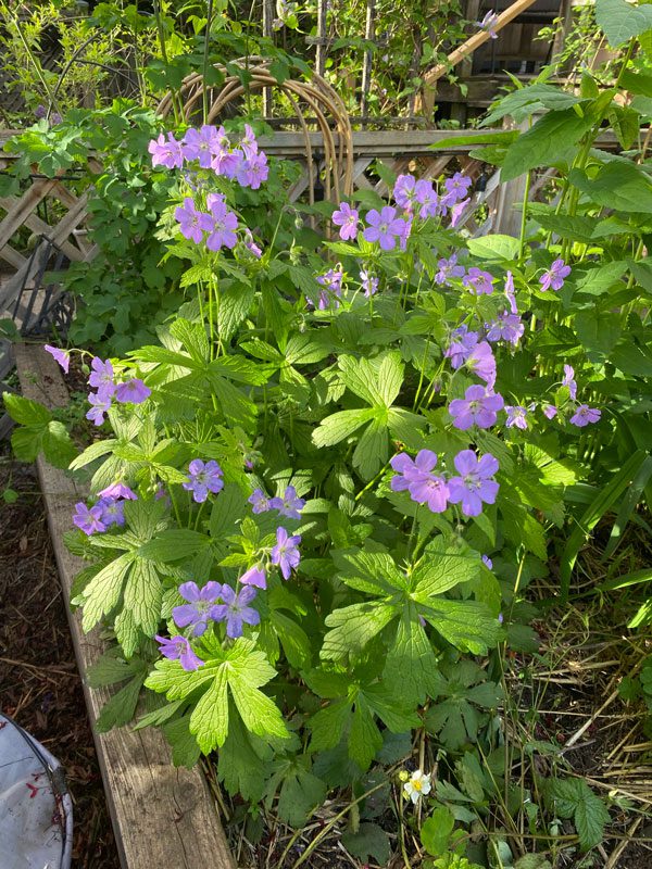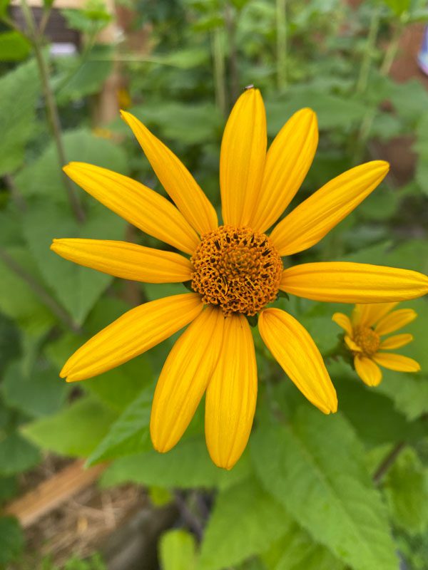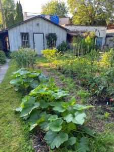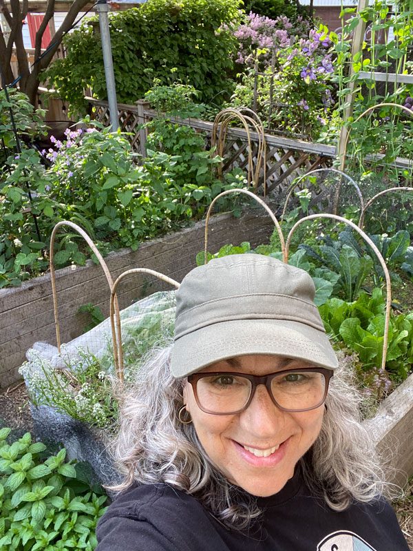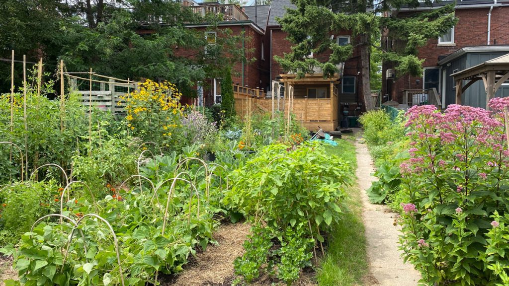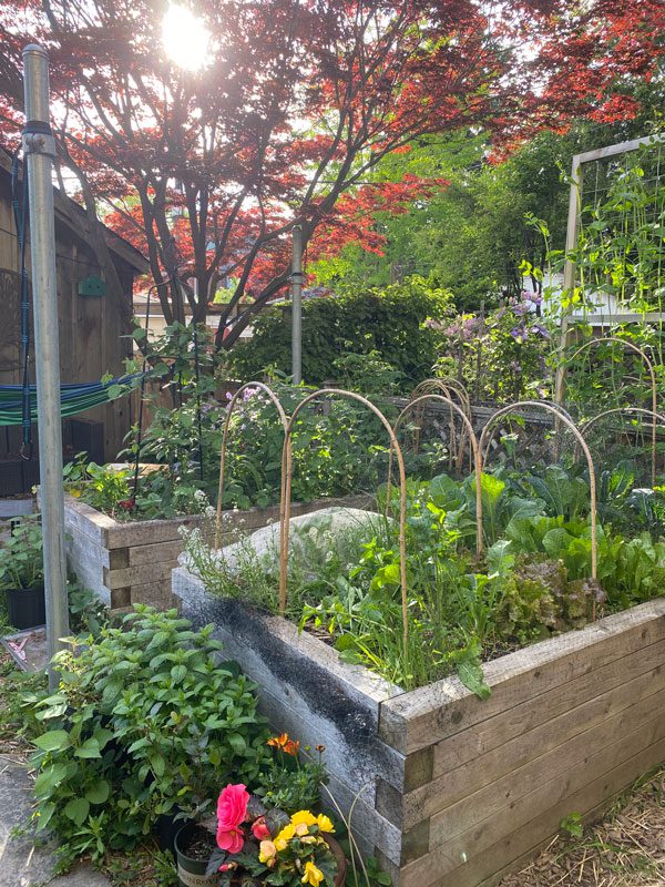 Our backyard garden is a lot like a woodland, shaded by mature trees, leaving just enough full sun for us to grow lots of happy, leafy greens. Peas do well, as do cucumbers, surprisingly, and our thornless blackberries are awesome! Since giving up on tomatoes in that too-shady location, we’ve transformed a second raised garden bed into a little native, pollinator garden that supports the veggies beside it, and brings beautiful texture, colours, scents, and fascinating insect and bird activity to our little space.