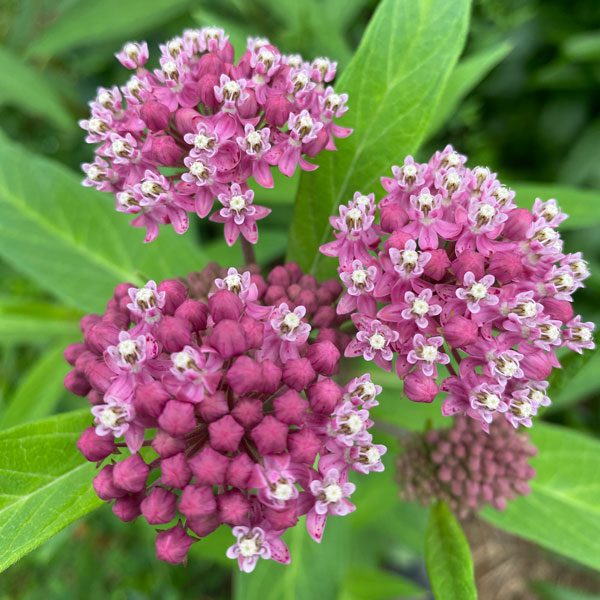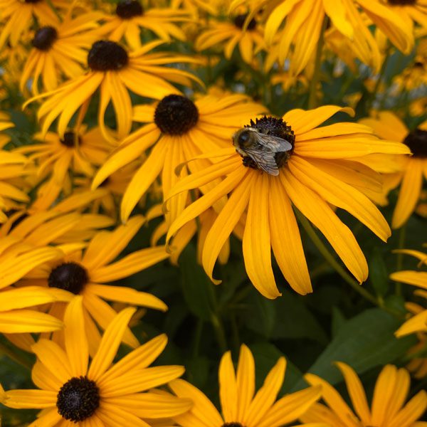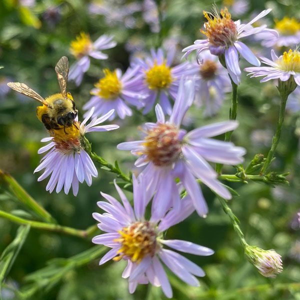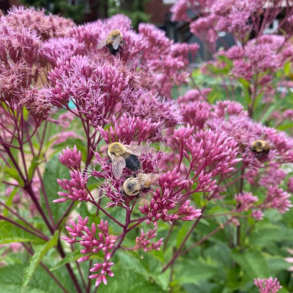 Favourite full sun pollinator plant varieties are Joe Pye Weed (Eutrochium purpureum), Large leaf Aster (Eurybia macrophylla), Smooth Aster(Symphyotrichum laeve), Black Eyed Susan (Rudbeckia hirta), Obedient (Physostegia virginiana), Wild Bergamot or Bee Balm (Monarda fistulosa) Purple cone flower (Echinacea purpurea), Swamp Milkweed (Asclepias incarnate). Chives, sage, thyme and oregano also flower in their second year, bringing a host of pollinators to the party.