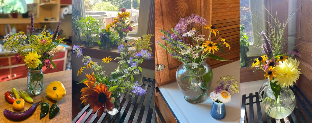 For many seasons I have focused on growing edible plants, but over the past few years my attention has been increasingly drawn to flowers, even the ones that aren’t edible. Their ecological role in nature is well known and that was my original motivation for adding them to our gardens. We have seen real proof that our vegetable yields improve significantly when they are companion planted with native flowers that attract pollinators. Today, some of our gardens are mostly flowers with only a few edible plants, and that inevitably leads to the crafting of flower bouquets. I am constantly amazed by how simple and fulfilling it is to create a gorgeous bouquet out of a seemingly random collection of flowers, herbs, grasses and greens from the garden. No need for extravagant vases, a humble mason jar is an inexpensive vessel that makes a beautiful gift when filled with flowers. My windowsills, tables, shelves and countertops are bursting with gorgeous arrangements that seem almost to have created themselves. Mother Nature makes it easy. And it is from her that I take my inspiration.