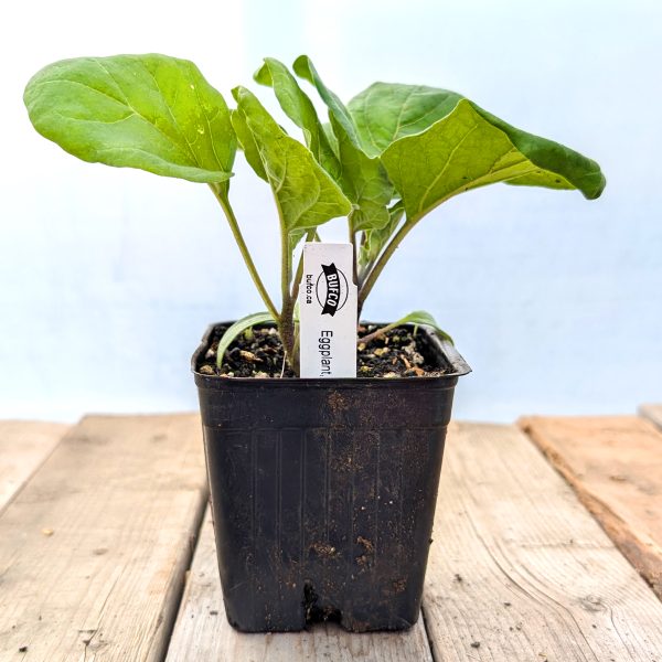 very prolific & early producer of medium-size, dark purple fruits, mild flavour & creamy texture, 70 days. 2 plants per 4″ pot.